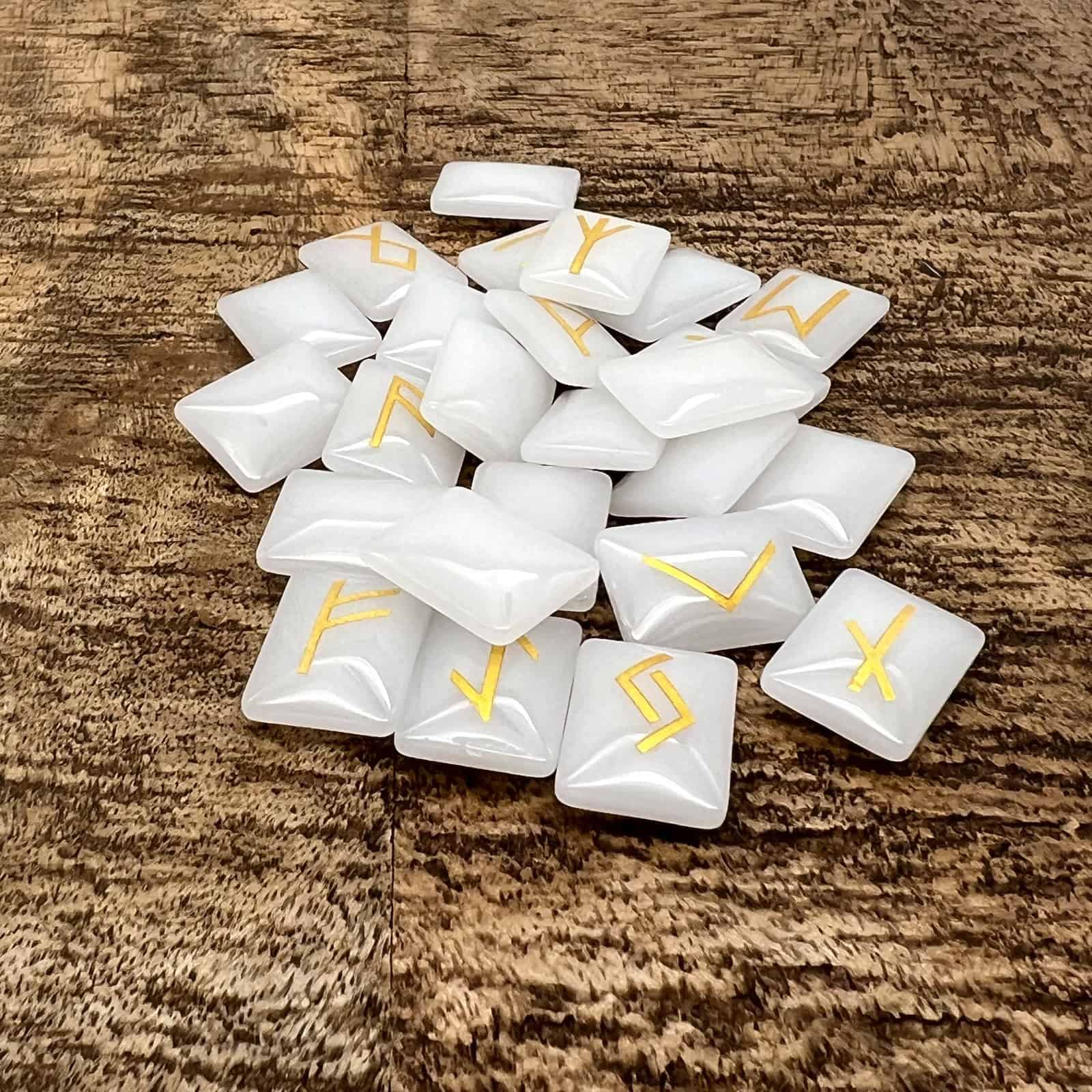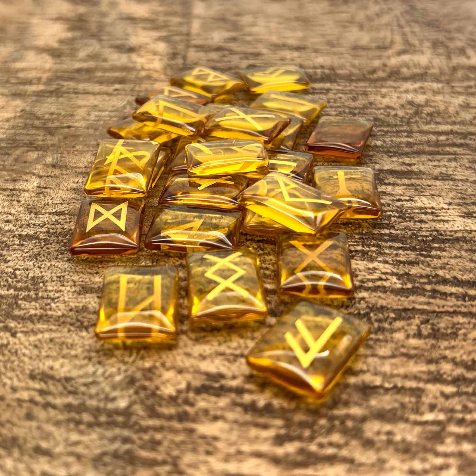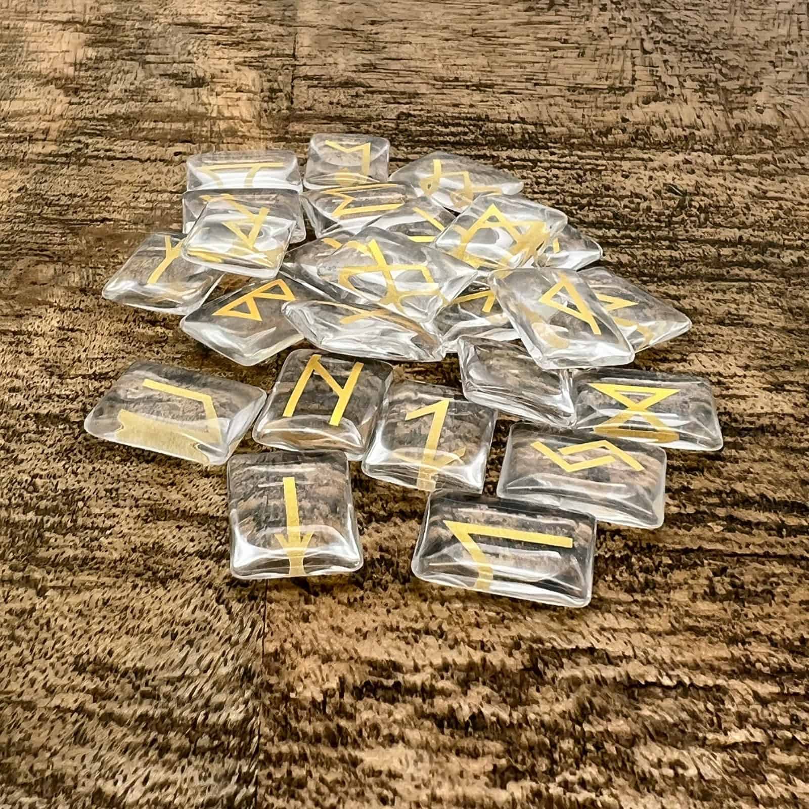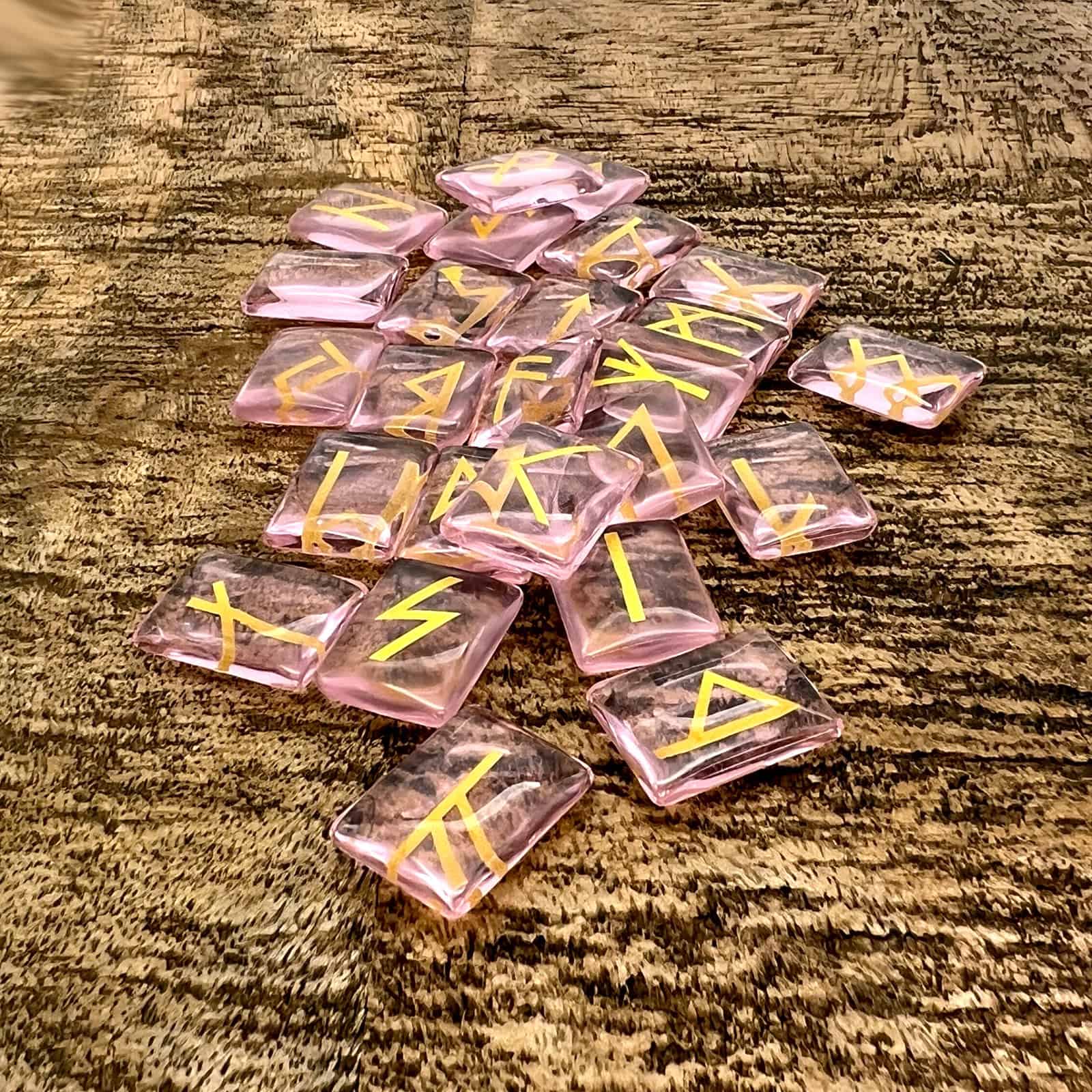 Our Traveler’s Runes come in seven different colors and are the perfect size for Elder Futhark Rune readings when away from home. Each set comes complete in a velvet bag with the standard 24 sigils plus the blank Wyrd. Each crystal rune stone measures approximately 14 mm by 19 mm in a smaller, convenient size for travel. The Traveler’s Runes are available in seven colors: